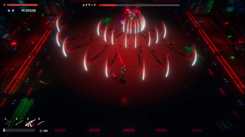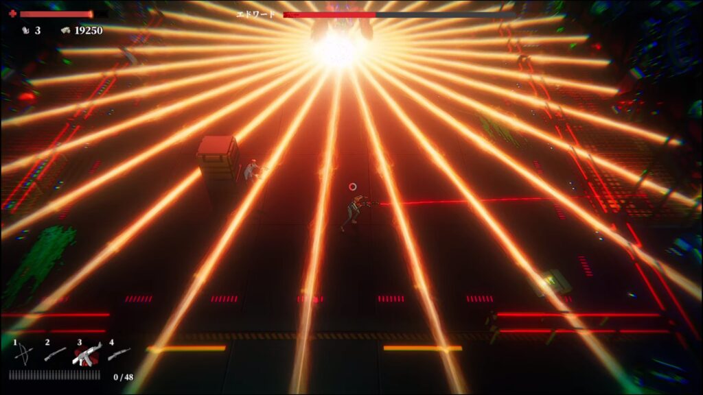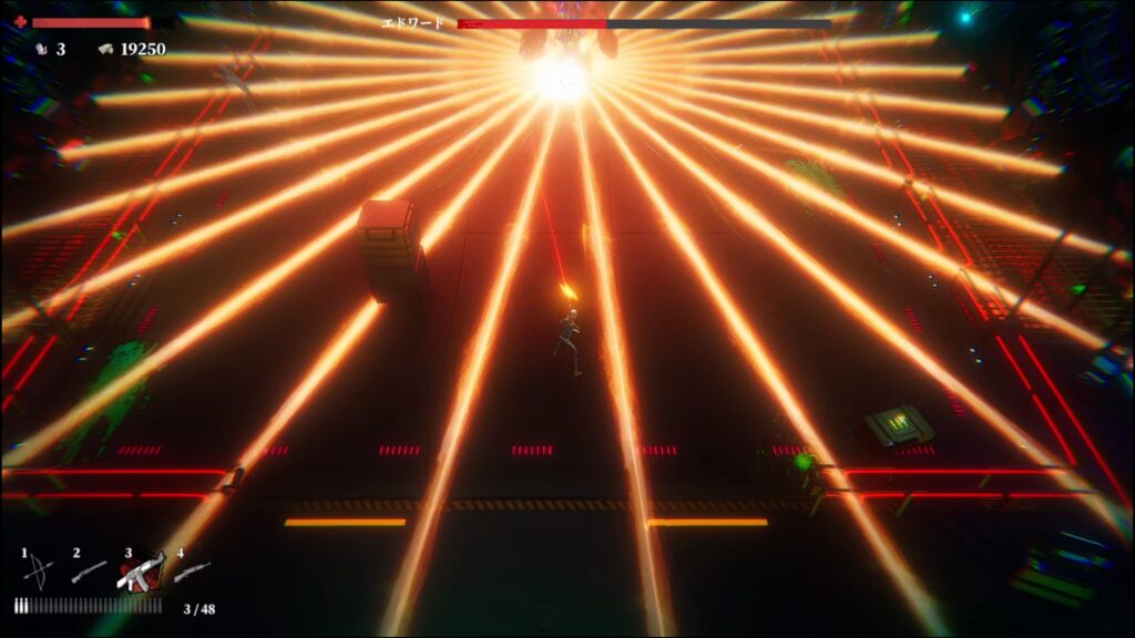 全方向に放つレーザーは敵から離れて1射目を避けた後、左右のどちらかに少し移動して2射目も避ける。