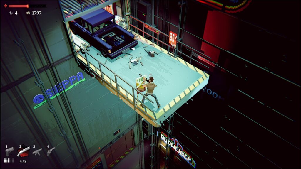 下の階で車が突っ込んでくるので、昇降機の端で避ける。車に当たると即死。
