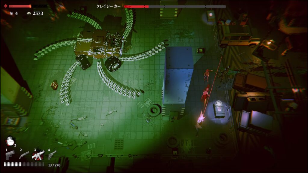 ボスは体力が少なくなると射撃をやめて轢き殺そうとするので、ローリングで回避しながら攻撃する。轢かれると即死なので注意。