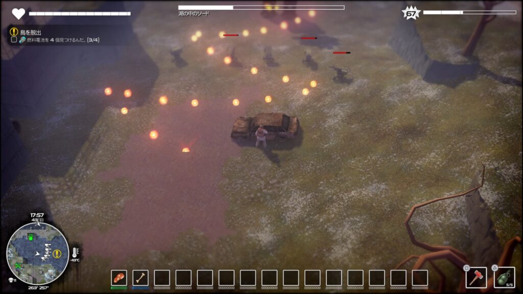 北東と南東のボス戦では、投擲武器を主体に戦うと良い。時間経過で出現する+1のアイコンに近づくと装備中の投擲武器の所持数が回復する