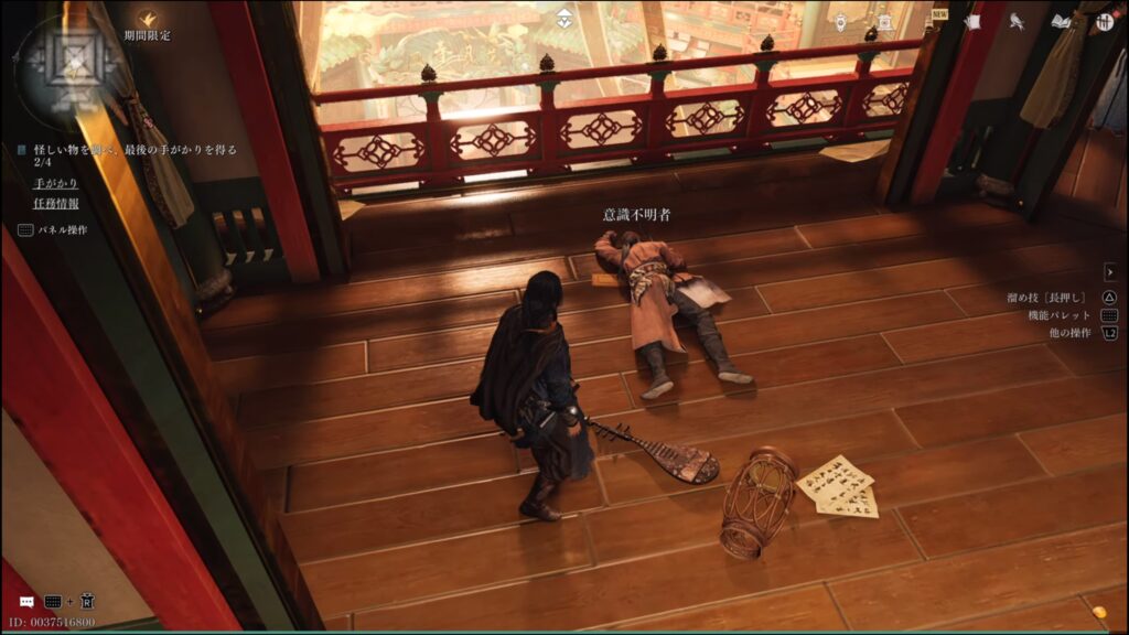 • 意識不明者の近くにある琵琶と招待状を調べる