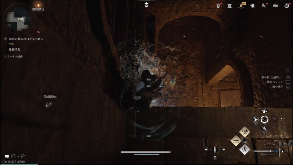 - 通路を進み、火矢のトラップ前で飛び降りる