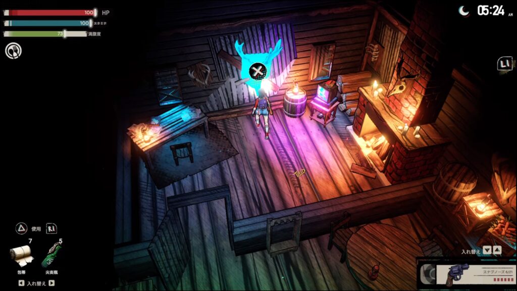扉の場所から北東へ少し進むと足跡がある。足跡を辿り櫓まで行く。櫓の上と近くの木箱に手がかり。