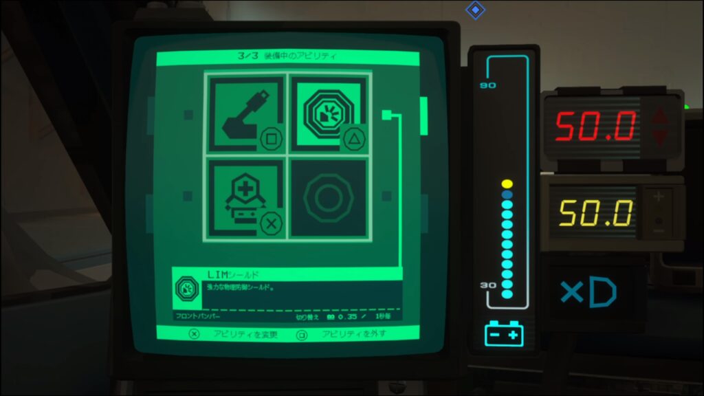 - 設定したボタンを押すとバッテリーを消費してアビリティを発動する(下の画像の場合は、三角ボタンでLIMシールドを発動)