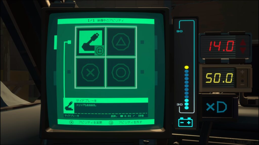 - 運転席の左前のモニターでスキルを設定でき、運転席にいる時に設定したボタンを押すとサイドブレーキを使える
