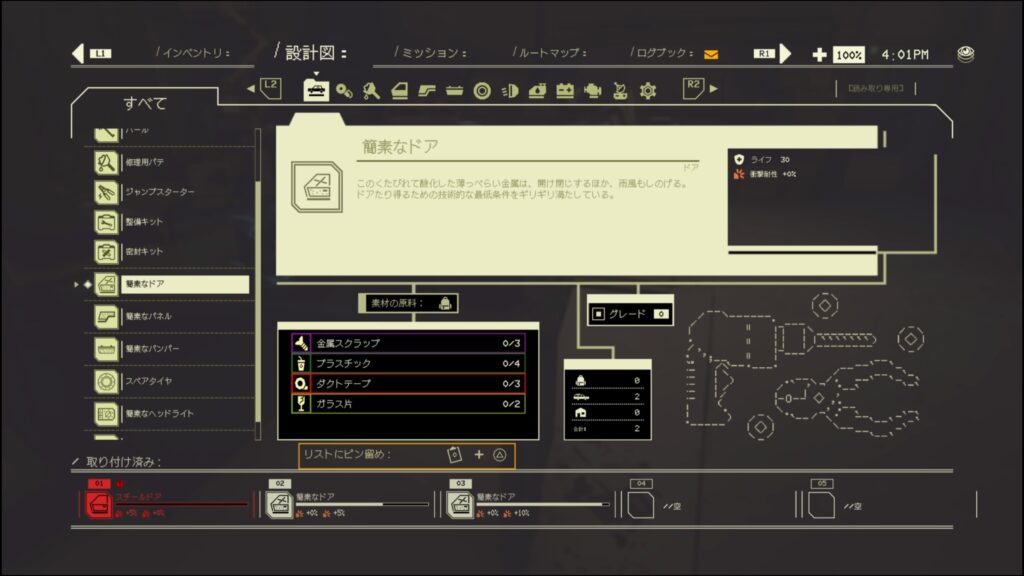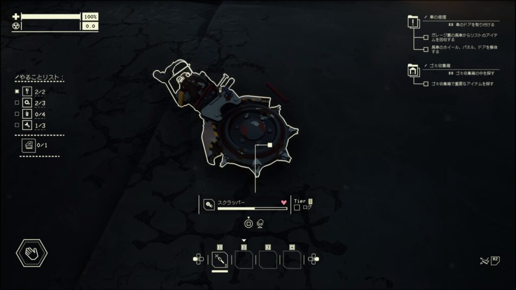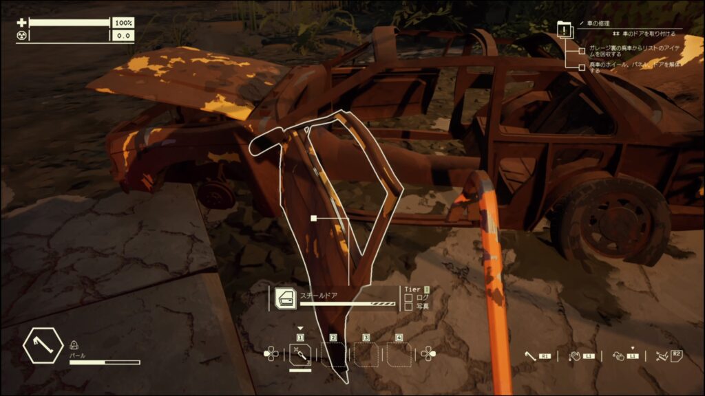 - この廃車は探索から戻るとパーツが復活するので、戻ってきたらパーツを解体するといい