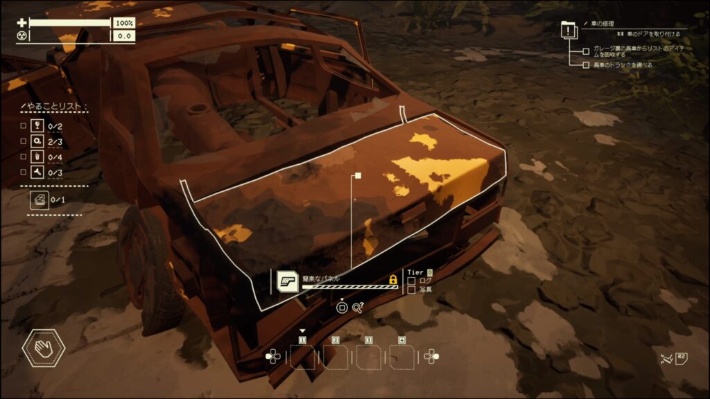 - 簡素なパネルの耐久ゲージの上に黄色い鍵マークが付いているので、トランクを調べるには装備でパネルをこじ開けるか壊す必要がある