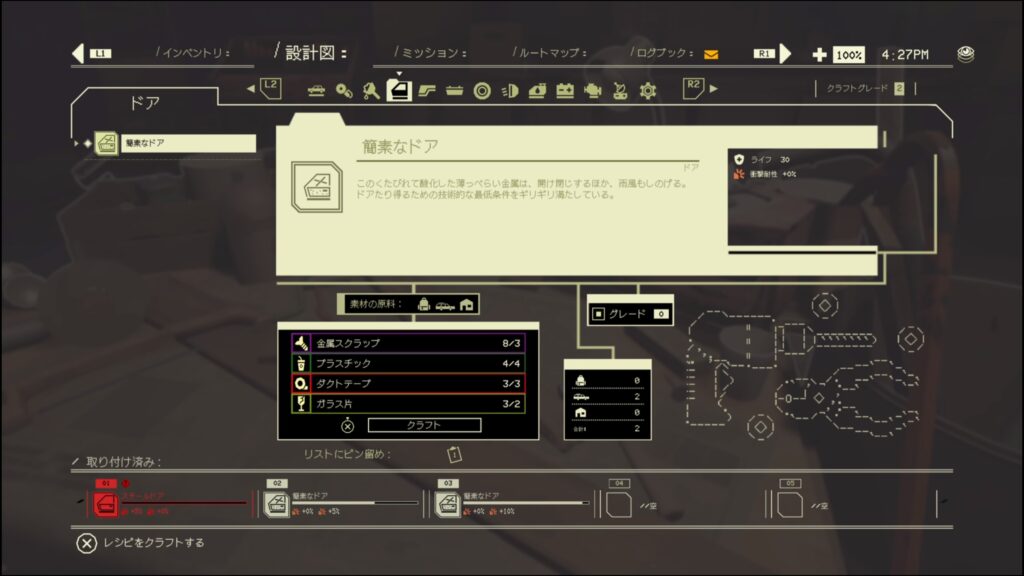 - ショップ内にあるワークショップにインタラクト→設計図→ドア→バツボタンで簡素なドアをクラフト
