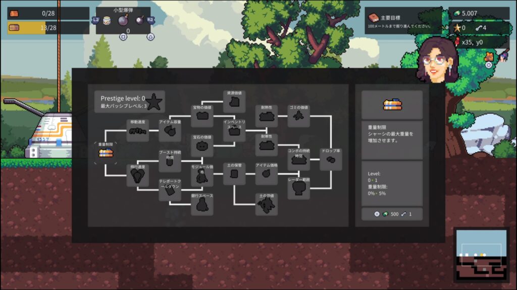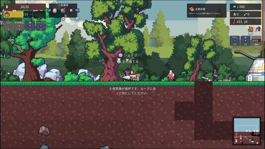 - 土タイルを掘り、土保管庫が満杯になったらルークに話しかける(土保管庫の容量は画面左上にのっており、最初は20まで)