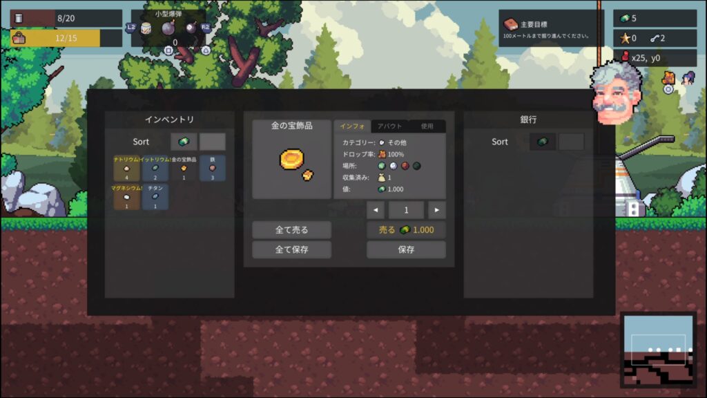 - インベントリが一杯だが、売りたくない場合はビルの銀行に預ける(保存)とよい