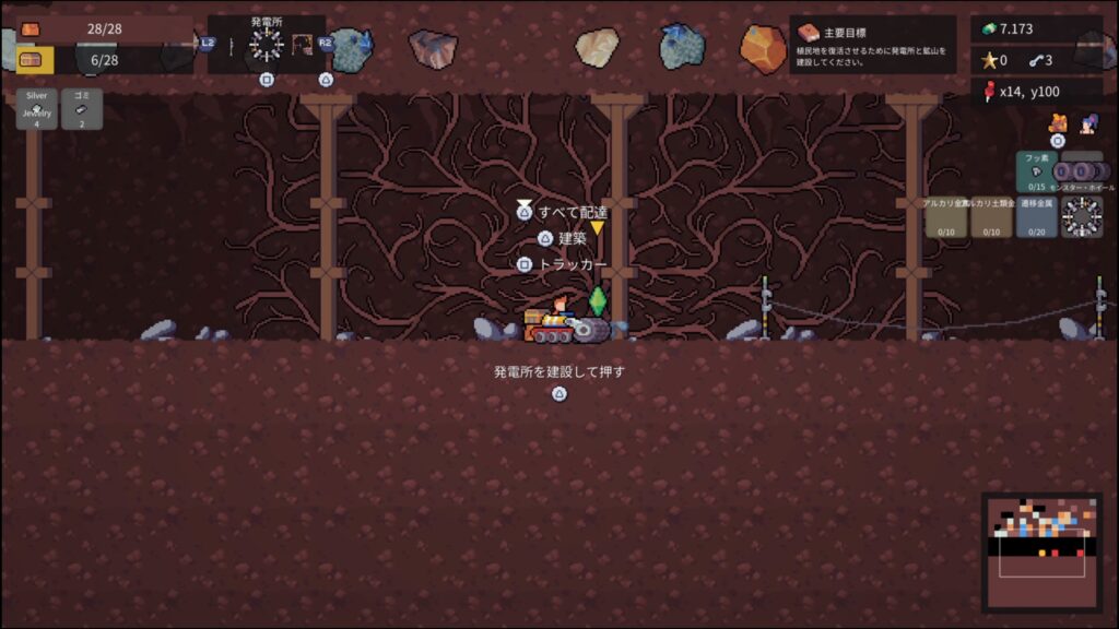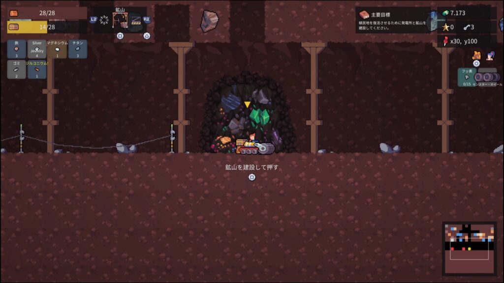 - 画面左上のアイテムメニューとビルドメニューを三角ボタンで切り替え、四角ボタンで鉱山を選択する