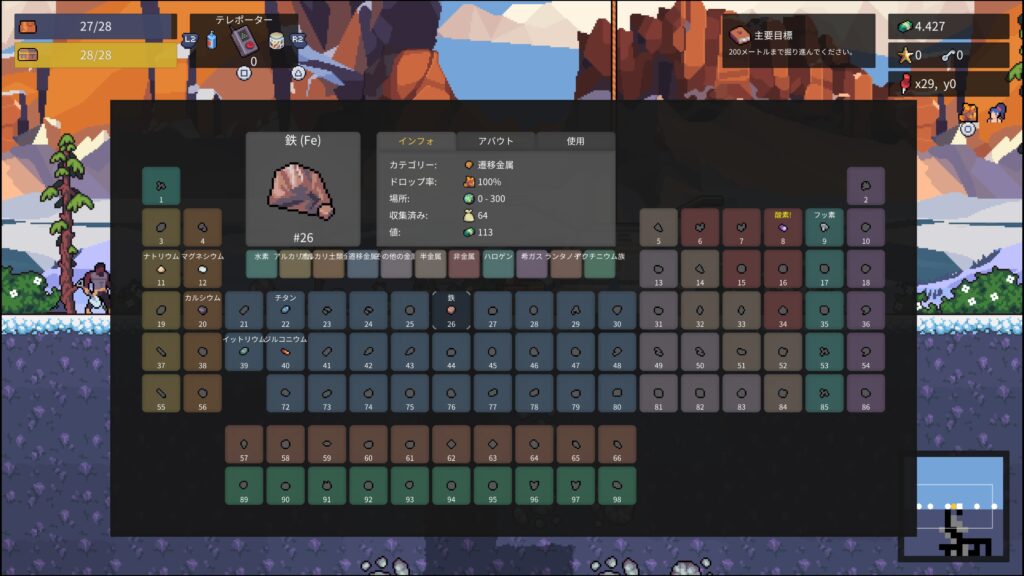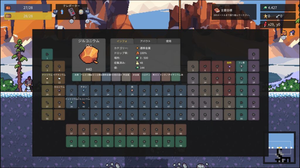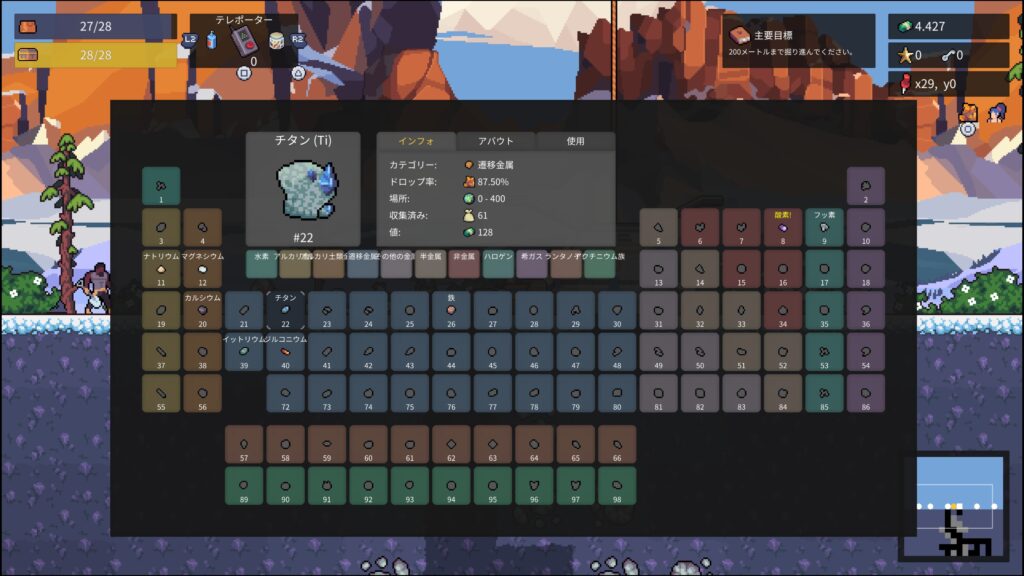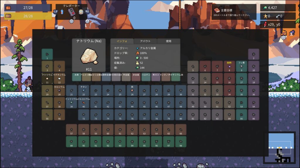 - 鉱山建設予定地にアルカリ金属10個、アルカリ土類金属10個、遷移金属20個を納品する(リソースのカテゴリーは丸ボタンで詳しく見られる)
