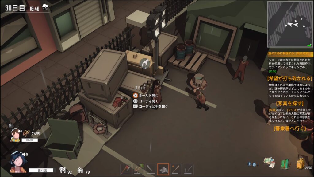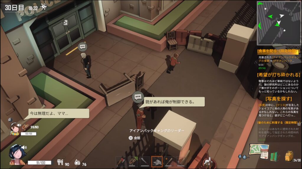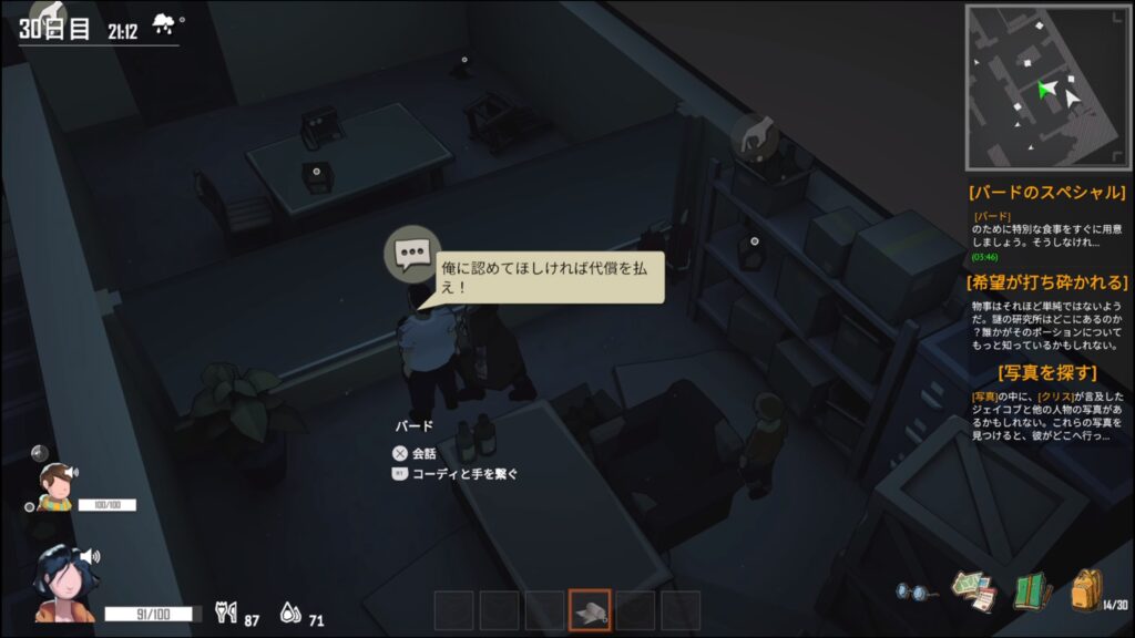 アイアンバックの特別食を作り、署内にいるバードに渡す。食事を渡した後、部屋を出る前にバードに賄賂としてアイテムを渡す。