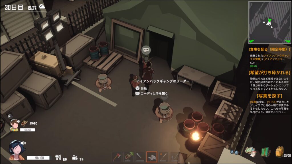 - 用意されたアイアンバックギャングの食事をアイアンバックギャングのキャプテンたちに配布する。
