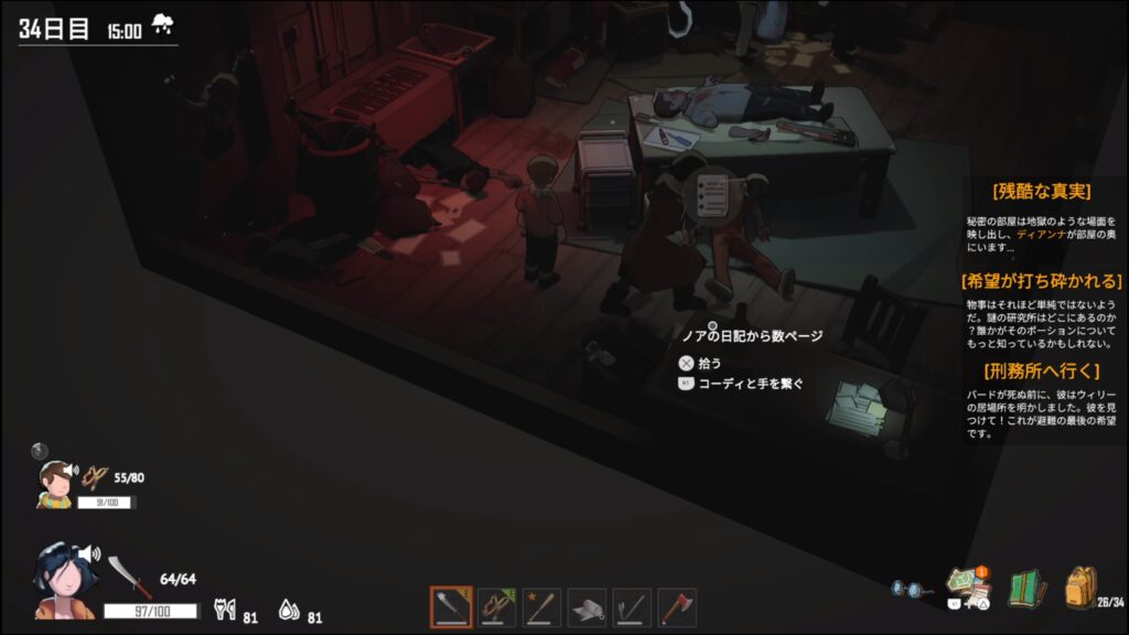 生存者キャンプに2回訪れると?ダイアナがいなくなっている。後日、生存者キャンプに行くとクエスト発生。